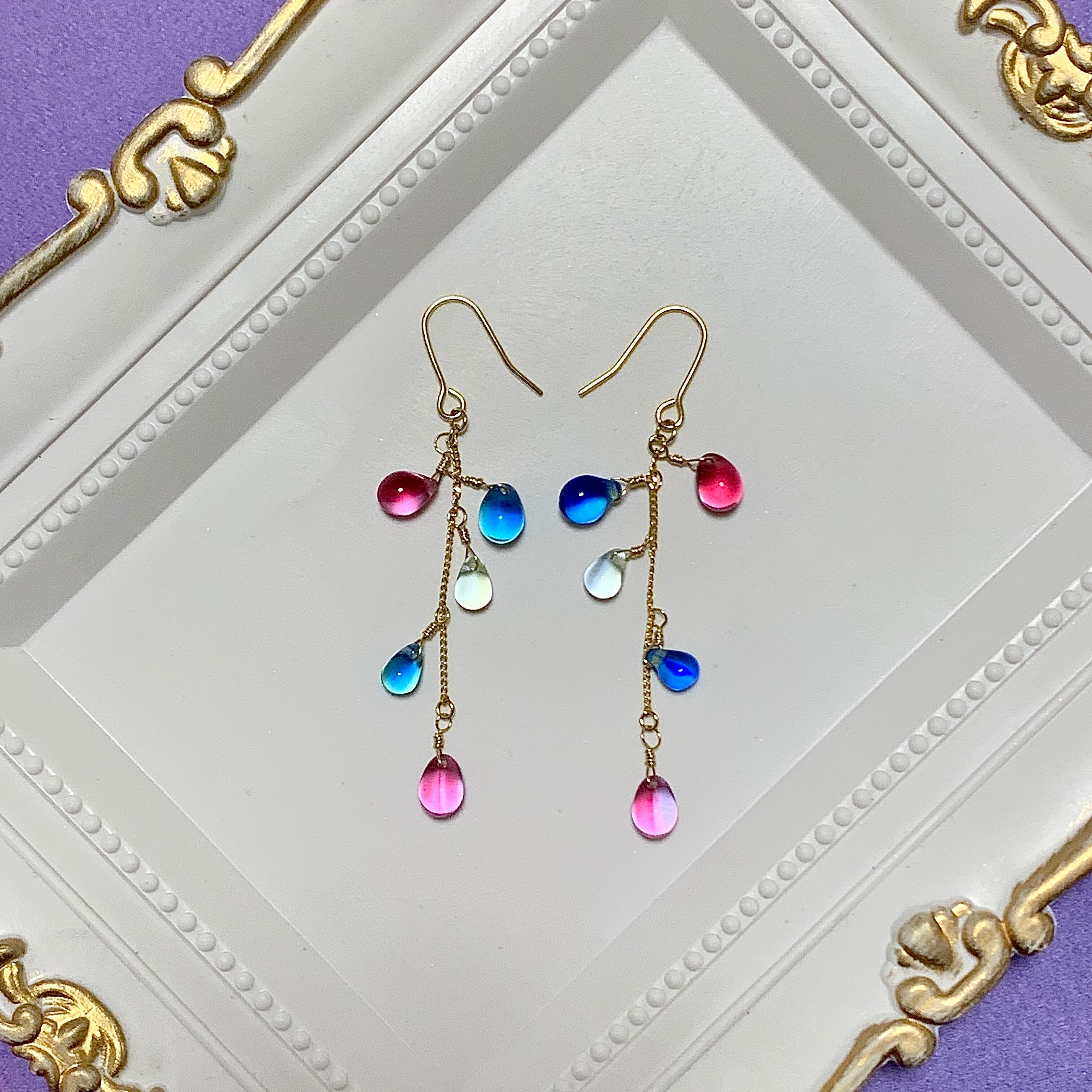 雨の雫をイメージした3色のチェコビーズが揺れるピアス