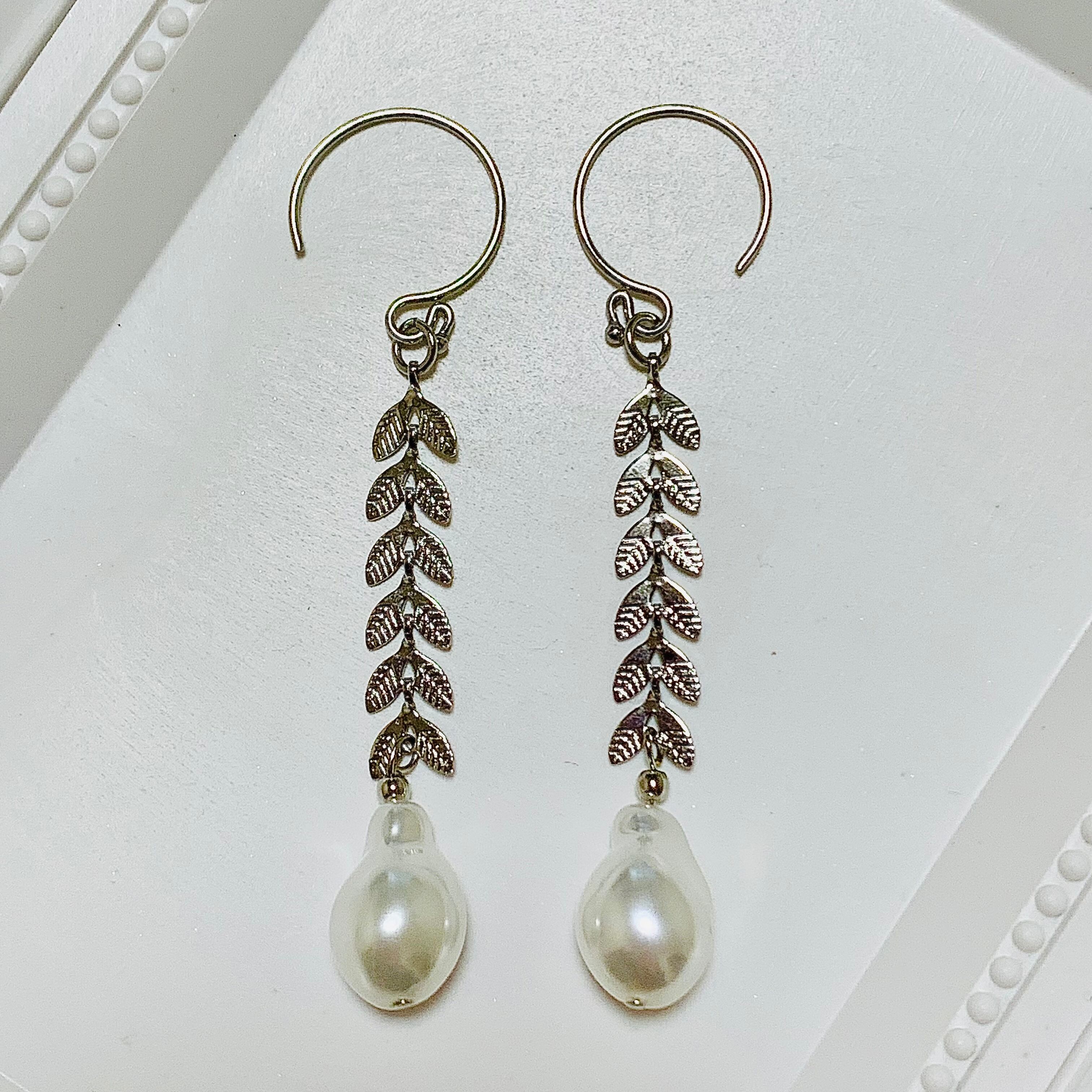 華奢なピアスフックから双葉の蔦が下がり、その先に洋梨のようなバロックパールがついています。
